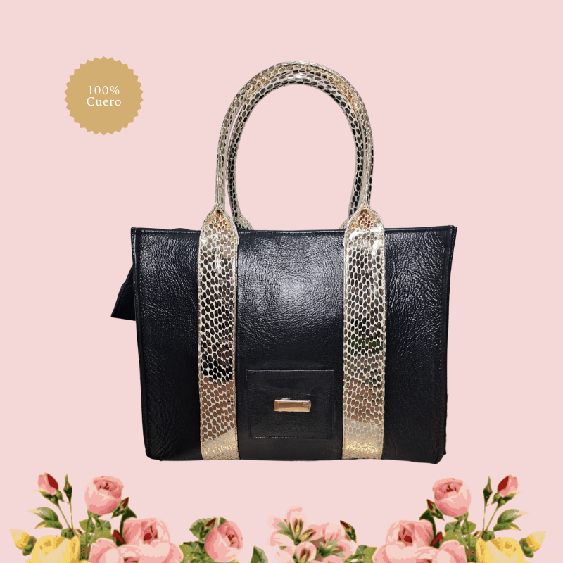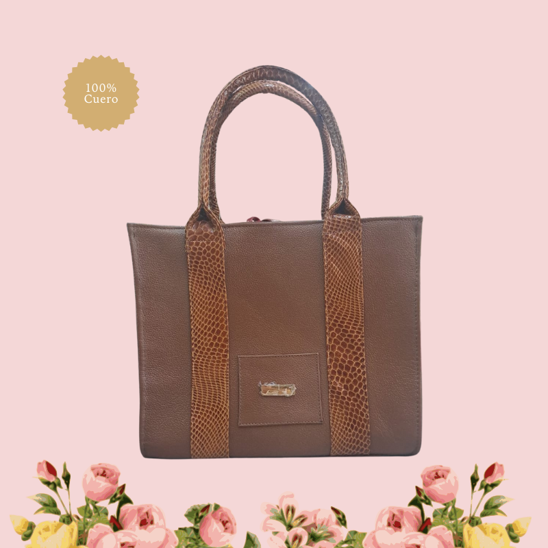 Bolso de cuero 100% genuino con diseño elegante y asas en contraste tipo pitón, inspirado en los tonos cálidos y misteriosos del desierto árabe.