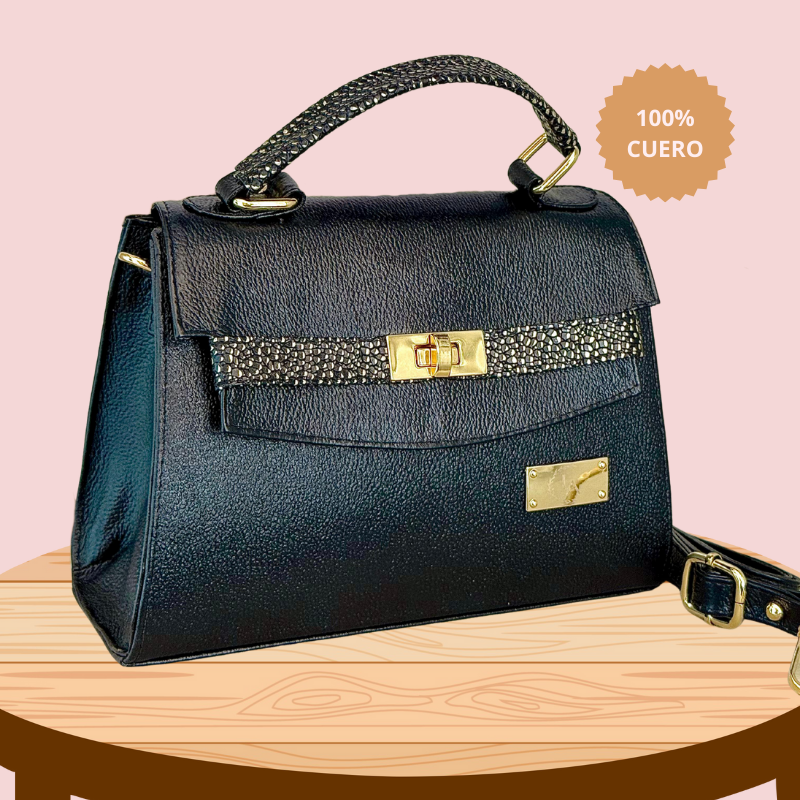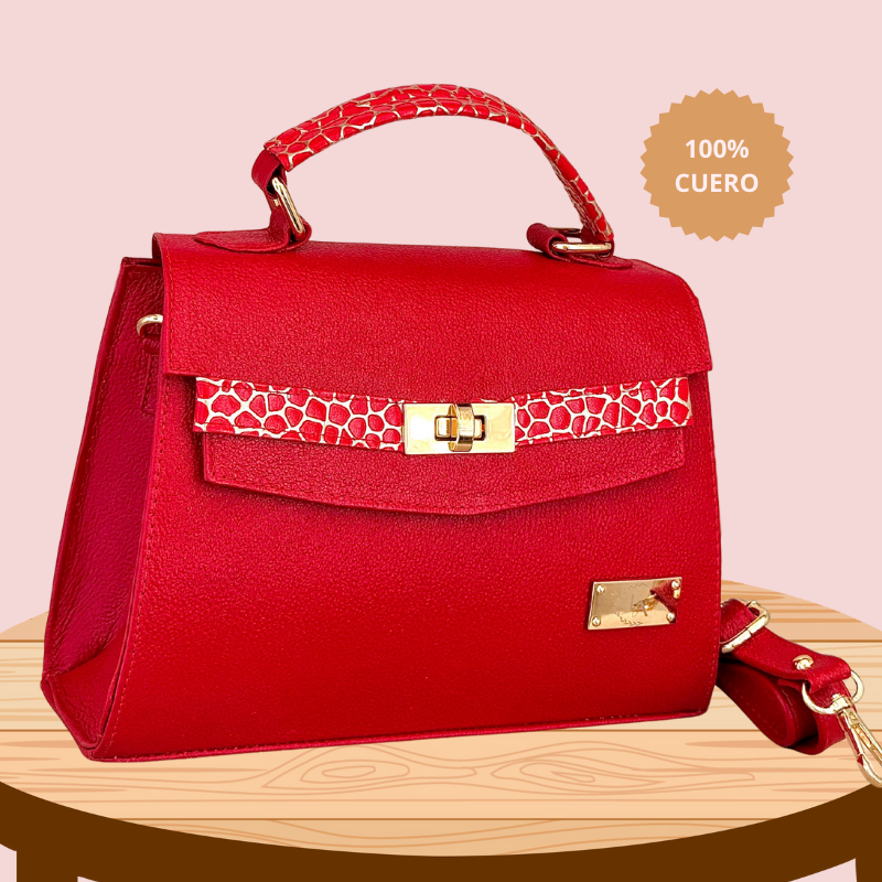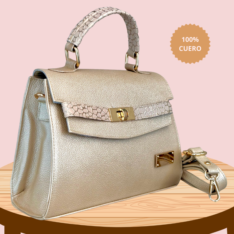 El Bolso Real de Amira de Princess Amira es una pieza de lujo hecha en cuero genuino, que fusiona la tradición artesanal con un estilo contemporáneo. Su diseño estructurado con líneas limpias y su herraje dorado le otorgan un aire de sofisticación, mientras que el detalle en el asa superior con textura animal print añade un toque distintivo y moderno.