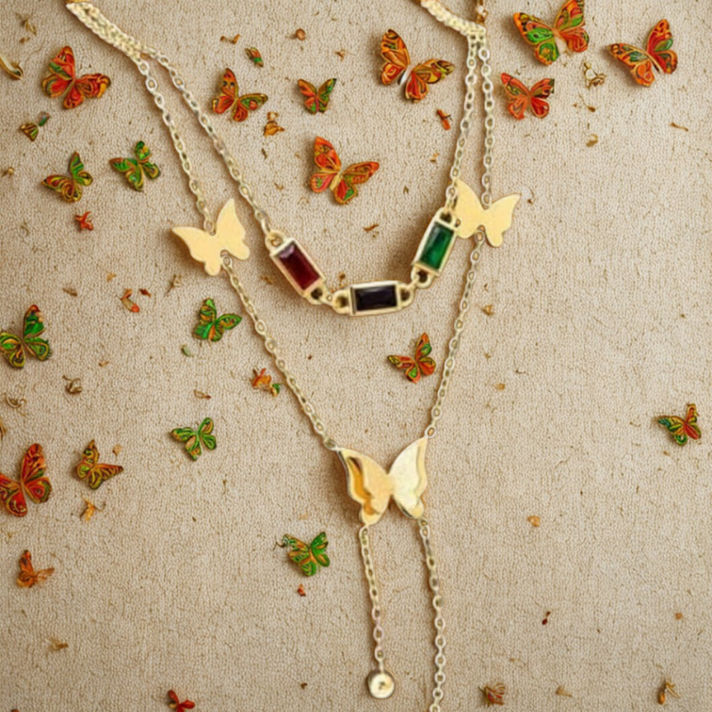 El Collar Farasha celebra la libertad y la ligereza de la mariposa, símbolo de transformación y belleza. Elaborado en acero inoxidable de alta resistencia, este diseño presenta delicadas figuras de mariposas doradas combinadas con piedras rectangulares en tonos vibrantes (verde esmeralda, rojo rubí y negro ónix).