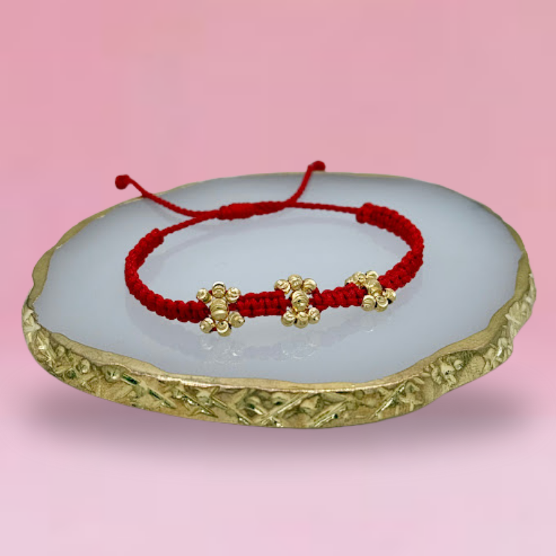 Elaborada en hilo rojo tejido a mano, reconocido por simbolizar protección, energía positiva y buena suerte, está adornada con dijes de oro laminado en forma de pequeñas flores cruzadas que aportan un brillo delicado y sofisticado.