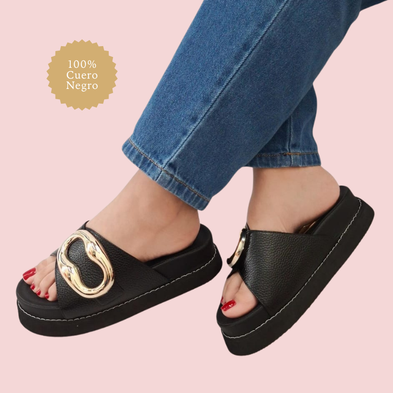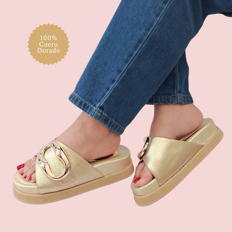 El detalle protagónico es su herraje dorado tipo estribo, que le da un toque refinado y moderno. Su diseño tipo slide permite un calce rápido, ideal para combinar con atuendos casuales o sofisticados.