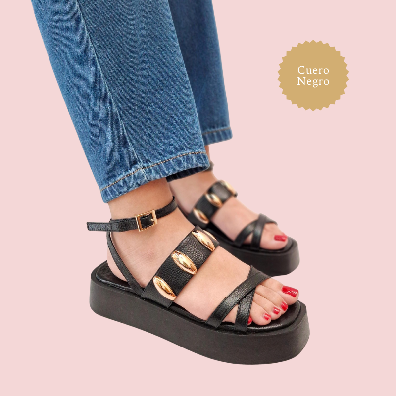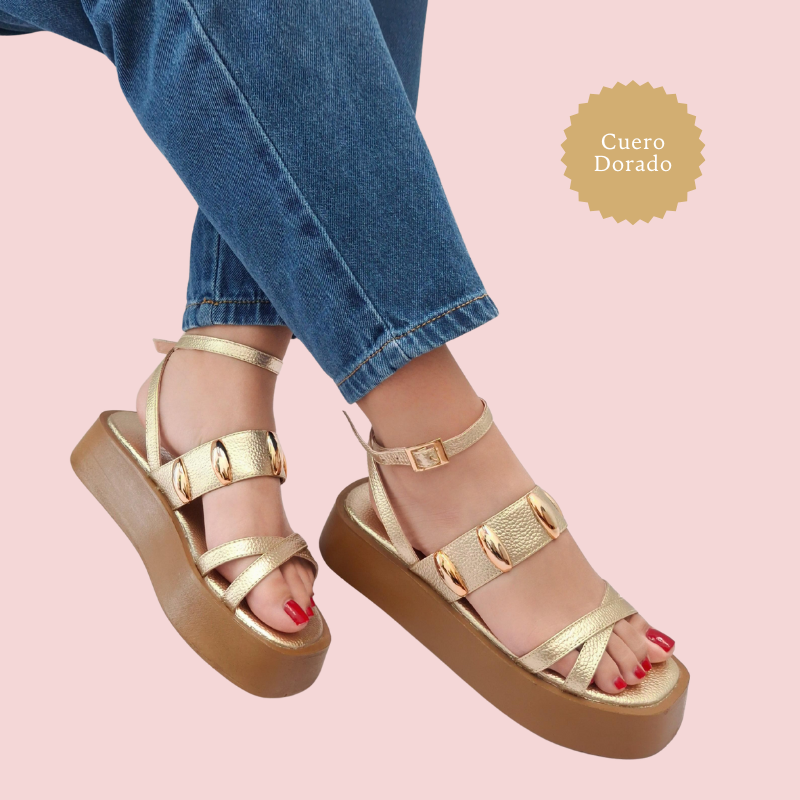 Cuenta con cierre de hebilla ajustable, plantilla acolchada y suela tipo plataforma que estiliza la figura sin sacrificar comodidad. Ideal para elevar cualquier outfit casual o de playa con un toque de elegancia exótica.