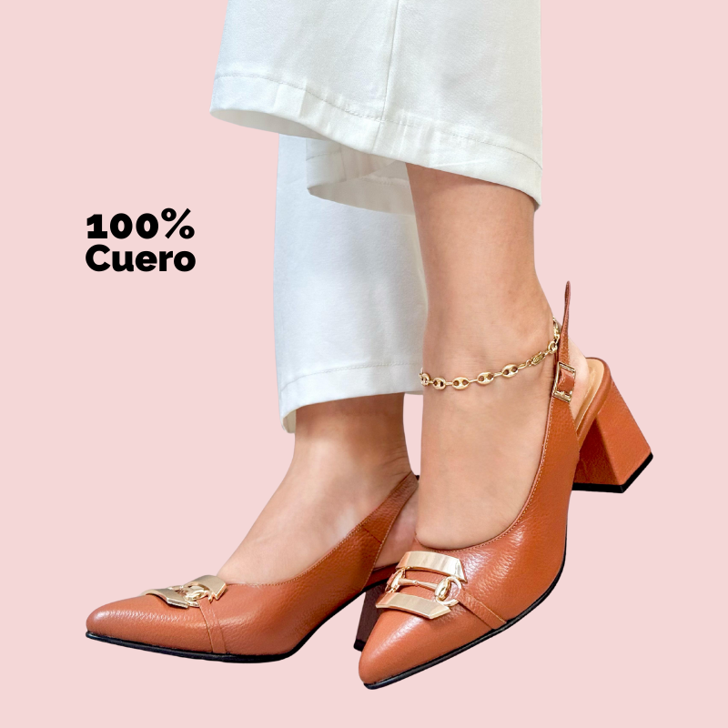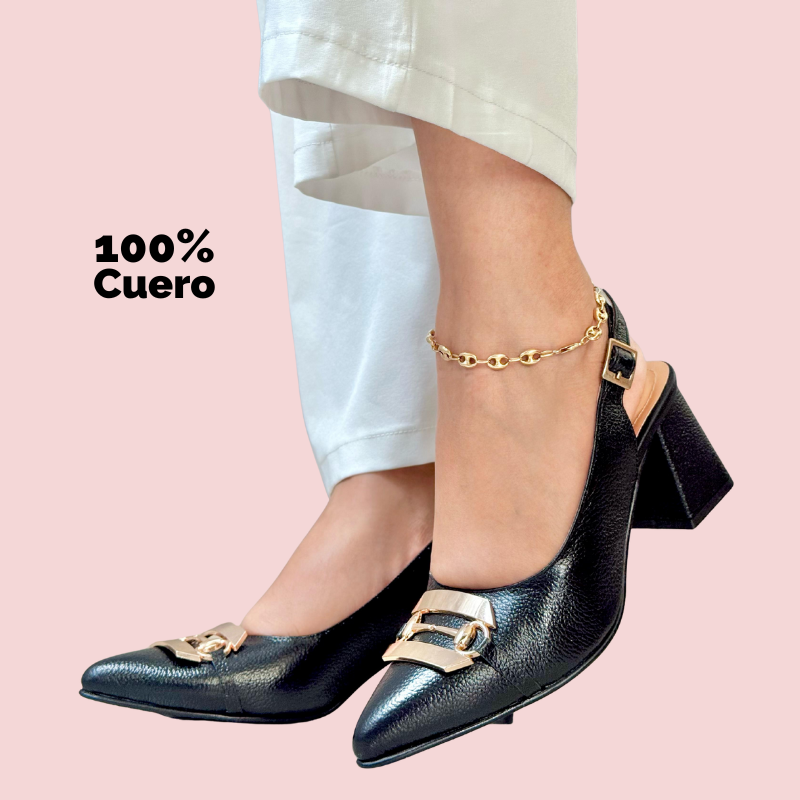Los Zapatos Zahra están diseñados para brindar elegancia, comodidad y distinción. Fabricados en 100% cuero, con tacón medio cuadrado y un moderno diseño tipo destalonado, incluyen una llamativa pieza decorativa dorada en acero inoxidable sobre el empeine que los convierte en una pieza sofisticada y versátil para cualquier ocasión.